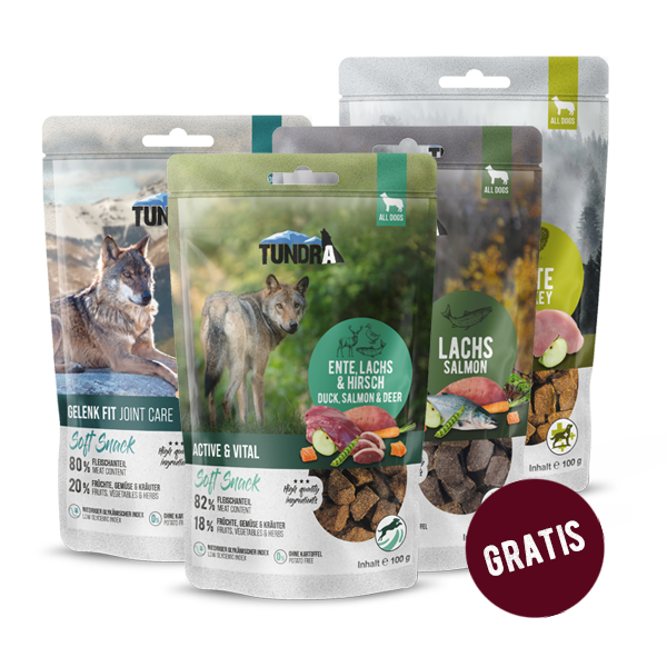 Heute schenken wir euch einen GRATIS Tundra Snack nach Wahl ab einem Einkauf von 15 EUR. Legt direkt den Lieblings-Snack eures Hundes in den Warenkorb!